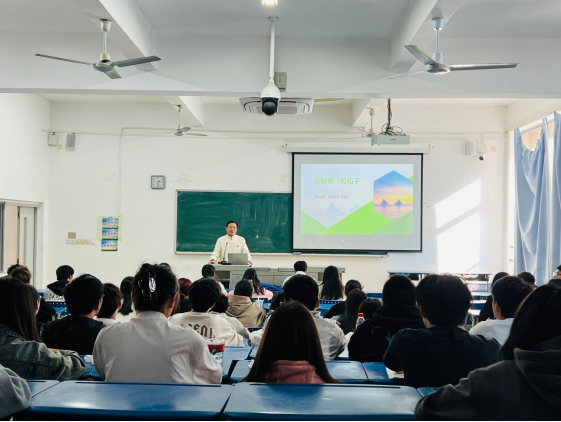 12月8日下午,学院纪委书记郭根才为软件234、服设234班级学生讲授《扣好第一粒扣子》专题思政课。思政部部分教师参加。